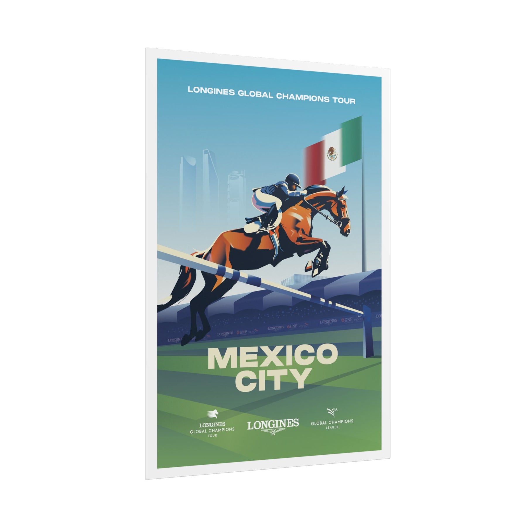Celebrate the vibrant energy of one of the most exciting legs of the Longines Global Champions Tour with this bold Mexico City poster. Featuring a powerful jump against the backdrop of Mexico’s iconic skyline and national flag, this A2-sized print captures the passion, precision, and spectacle of the tour’s Latin American stop.