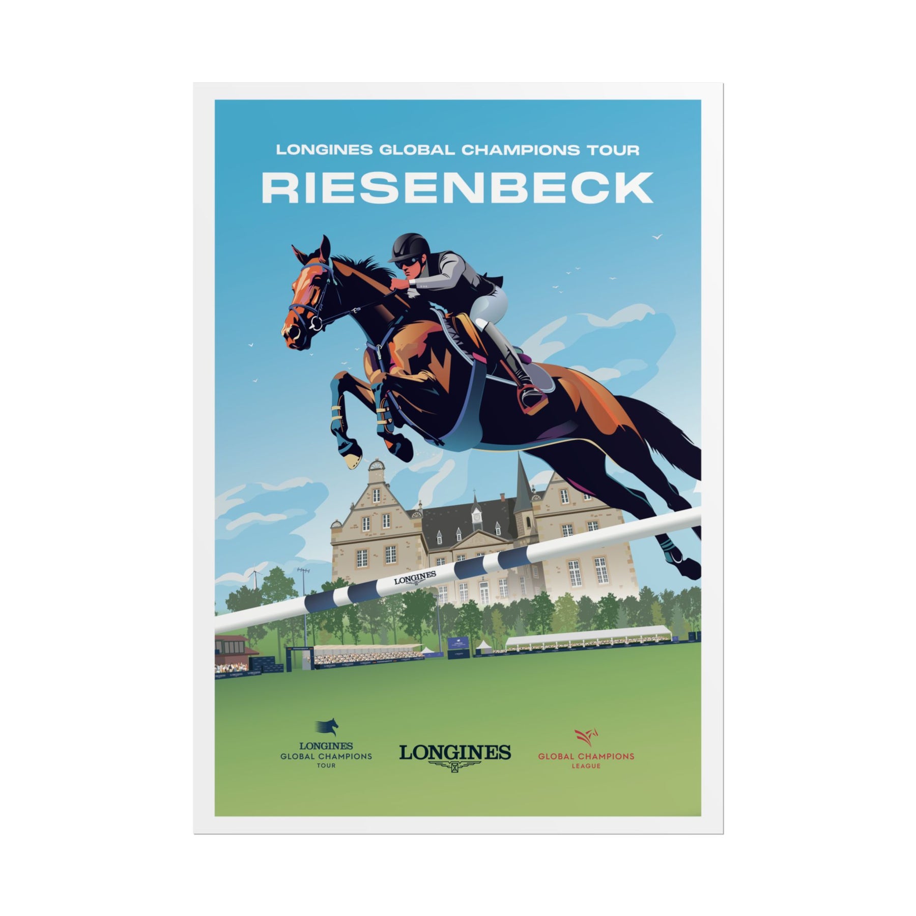 Celebrate the tradition and excellence of German equestrian sport with this official Riesenbeck poster from the Longines Global Champions Tour. This A2-sized artwork captures a thrilling moment mid-jump, set against the picturesque backdrop of Riesenbeck International and its iconic architecture.
